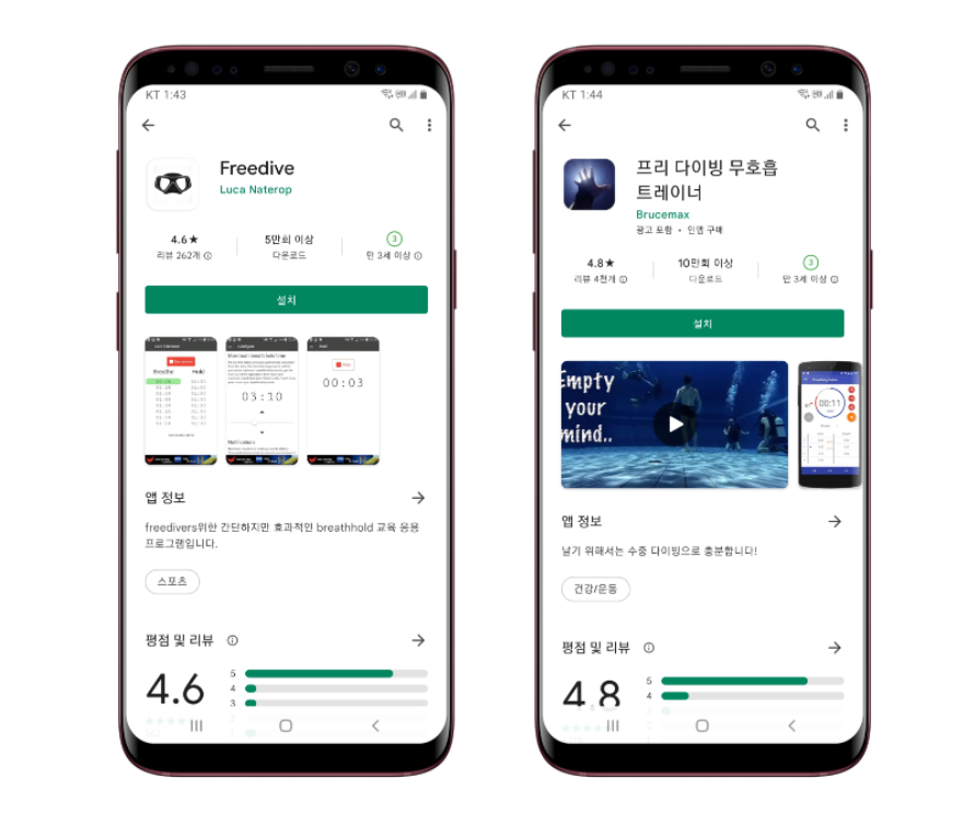 끝으로 수영장에 가지 않아도 숨참기를 훈련할 수 있는 방법을 알려드릴게요. 앱에서 '프리다이빙' 'apnea'등으로 검색하면 프리다이빙 트레이닝 앱이 있습니다. 자신에게 맞는 것을 찾아서 사용하면 숨 참기 능력이 좋아질 겁니다.
