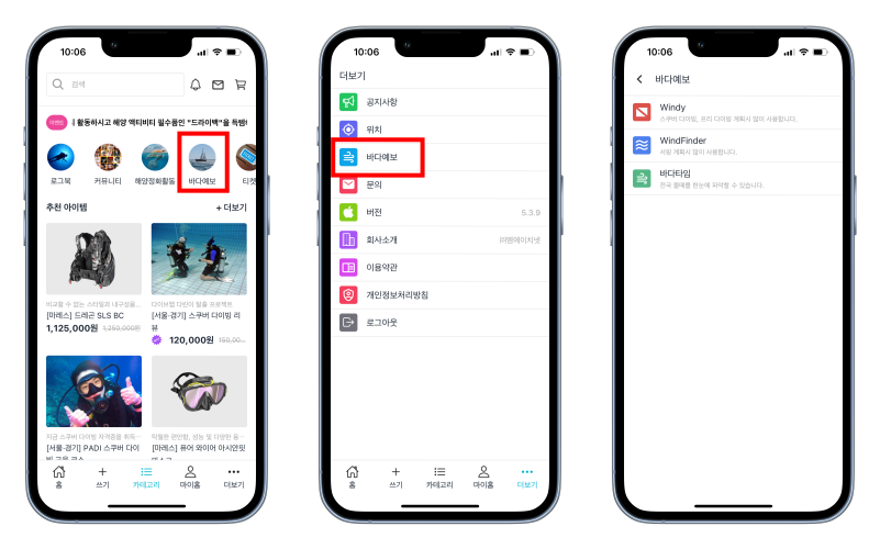 금번 업데이트에서 바다예보 링크 서비스가 추가 되었습니다. 스쿠버 다이빙 및 프리 다이빙에서 자주 사용하는 윈디, 서핑에서 자주 사용하는 윈드파인더 등 별도의 앱 설치없이 마린에서 바로 이용이 가능해졌습니다.