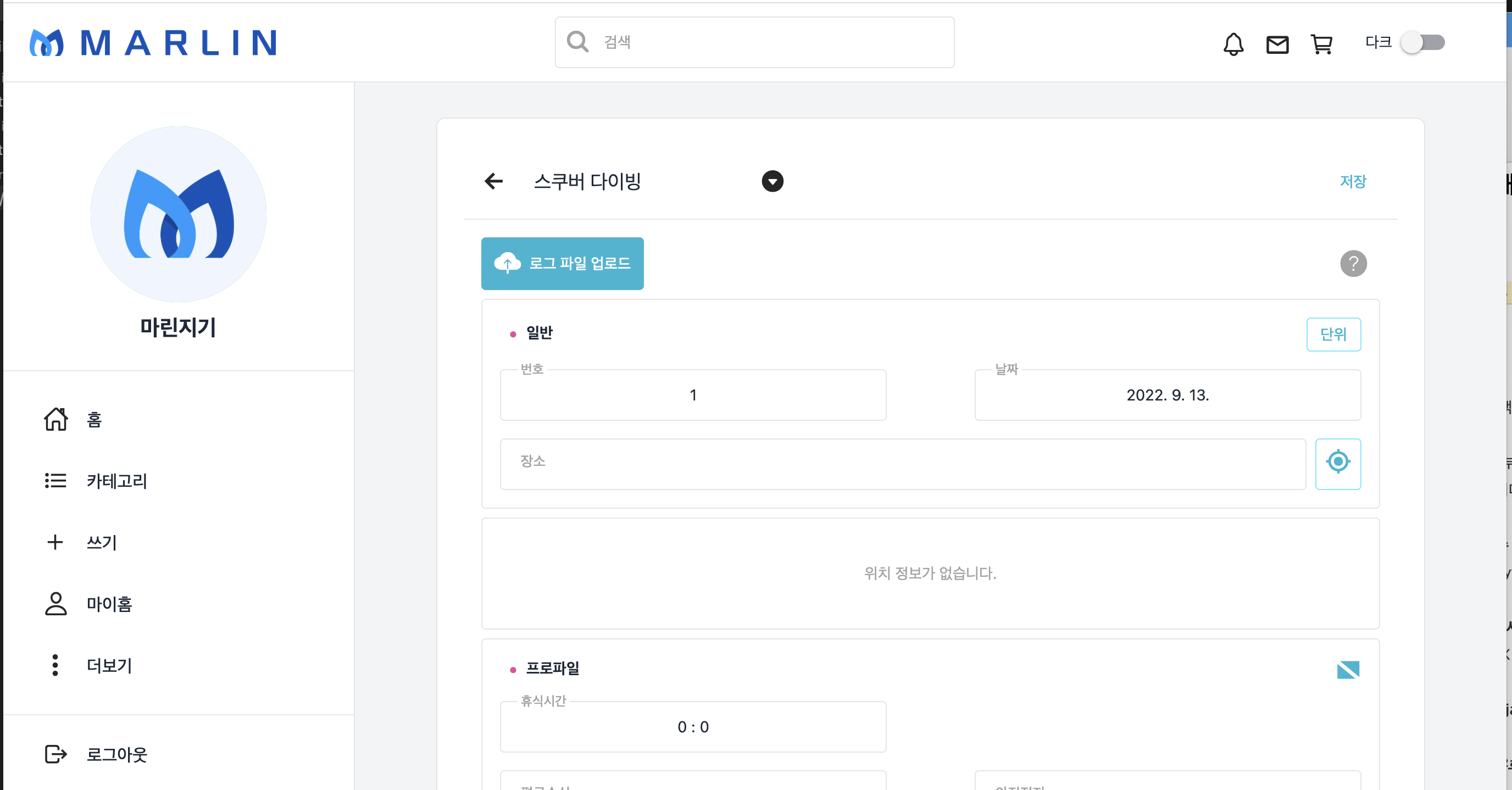 마린(MARLIN)은 스쿠버 다이빙, 프리 다이빙, 서핑, 세일링, 해양정화 캠페인 등 다양한 해양 액티비티 로그를 제공하는 소셜 기반 커뮤니티 플랫폼입니다