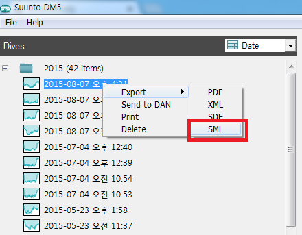 다이브 컴퓨터 제조사에서 제공하는 앱 또는 애플리케이션에 연결하여 로그 파일을 내보내기 하세요. 파일형식은 UDDF 형식으로 내보내기 하시면 됩니다. 순토 포맷인 SML 파일도 지원하니 참고 하세요.