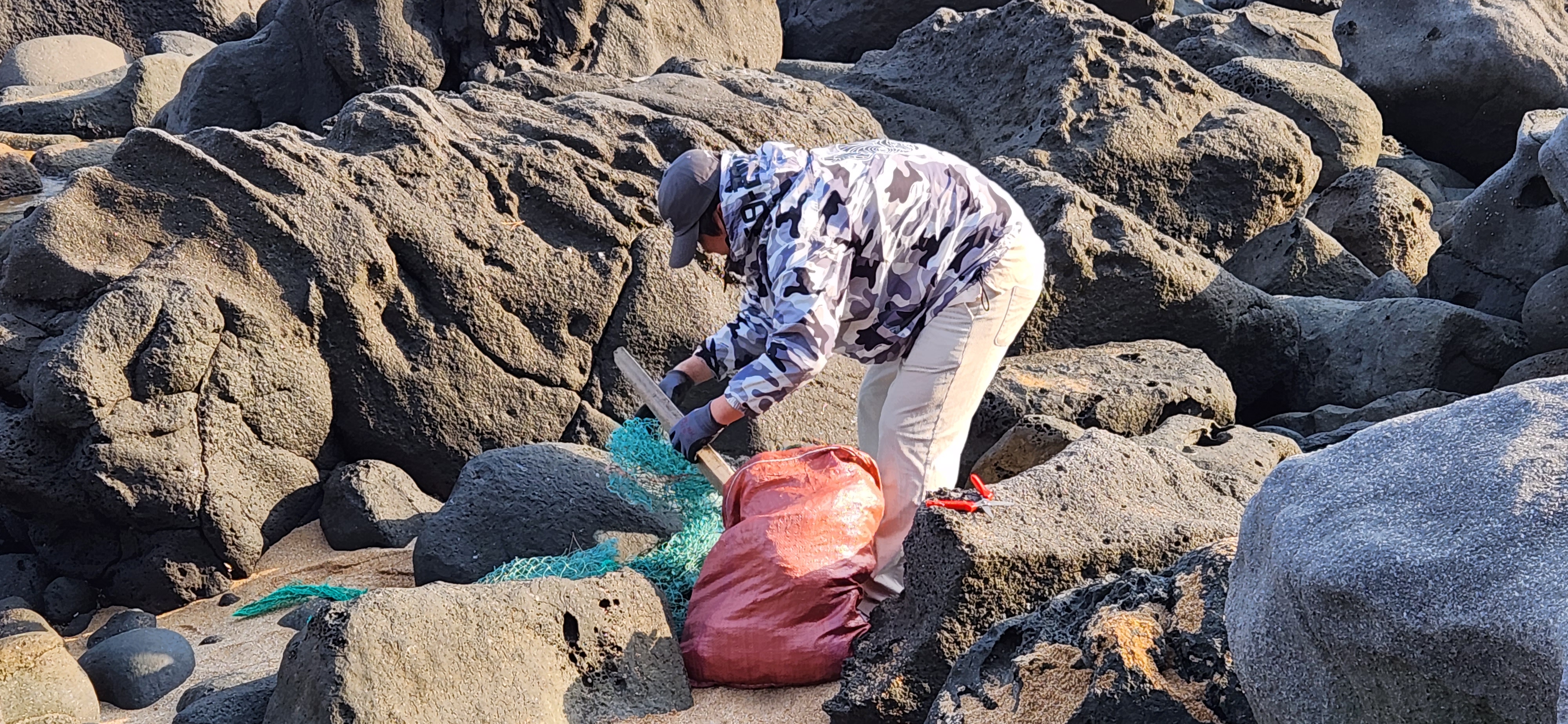 지난 3/16일 제주도 중문 색달 해수욕장에서 해양정화활동을 진행하였는데요. 이날 포대 5개 분량, 29kg의 밧줄과 그물을 수거하였습니다. 특히 바위에 휘감겨 있는 밧줄과 그물은 일일히 가위를 잘나내어야 해서 여간 힘든 작업이 아닐 수 없었습니다. 휴~