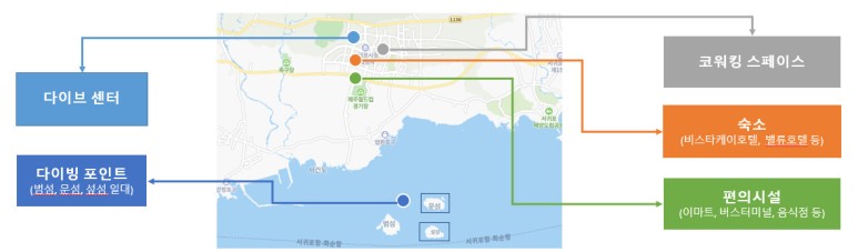 다이브맵 다이브센터는 스쿠버 다이빙과 워케이션을 함께 즐기고 싶은 노마드 다이버들을 위해서 다이브 센터 ➤ 다이빙 포인트 ➤ 코워킹 스페이스 ➤ 숙소(호텔)로 연결되는 편리한 동선 체계를 구축하여 스쿠버 다이버는 물론 제주도에 장기간 체류를 원하는 노마드 다이버에게도 만족감을 제공합니다.