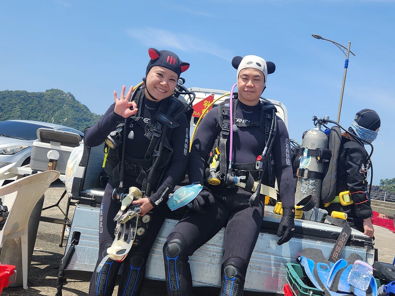 세계 각지 여행 하면서 체험 다이빙만 5번 넘게 하셨다는 일본 남매분이 이번엔 제주도에서 다이빙을 즐기셨는데요. 다이빙 마치고 하와이에서 다이빙 보다 좋았다고 엄지척 하시더라구요.