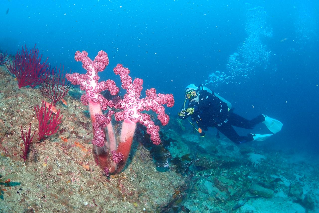 다양한 색채의 연산호가 암반 위에 광범위하게 퍼져 있으며, 이는 다양한 해양 생물의 서식처가 되어 생태계를 더욱 풍부하게 만듭니다.